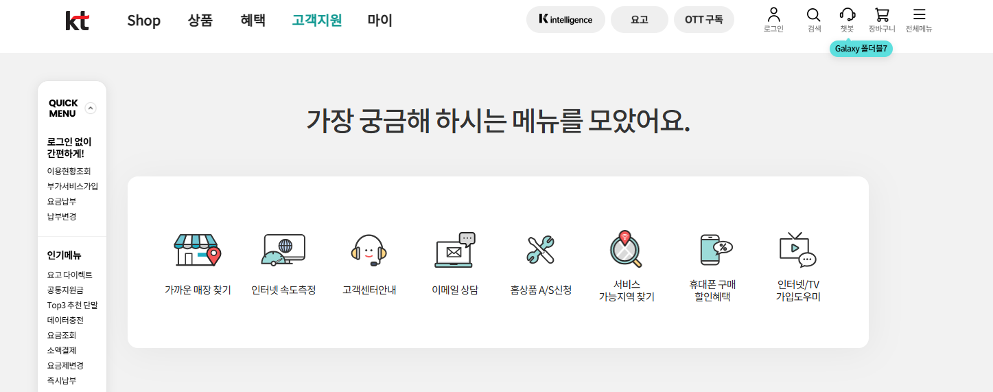 - KT 홈페이지: 온라인 지원서비스를 통한 24시간 상담