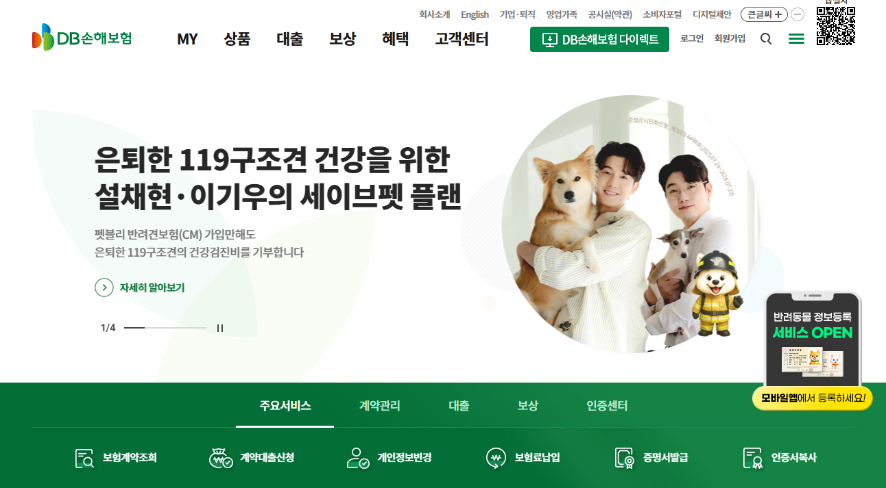 DB손해보험 대표 홈페이지입니다. 긴급출동, 계약관리, 대출, 보험가입상담, 보험금청구 등 서비스 제공